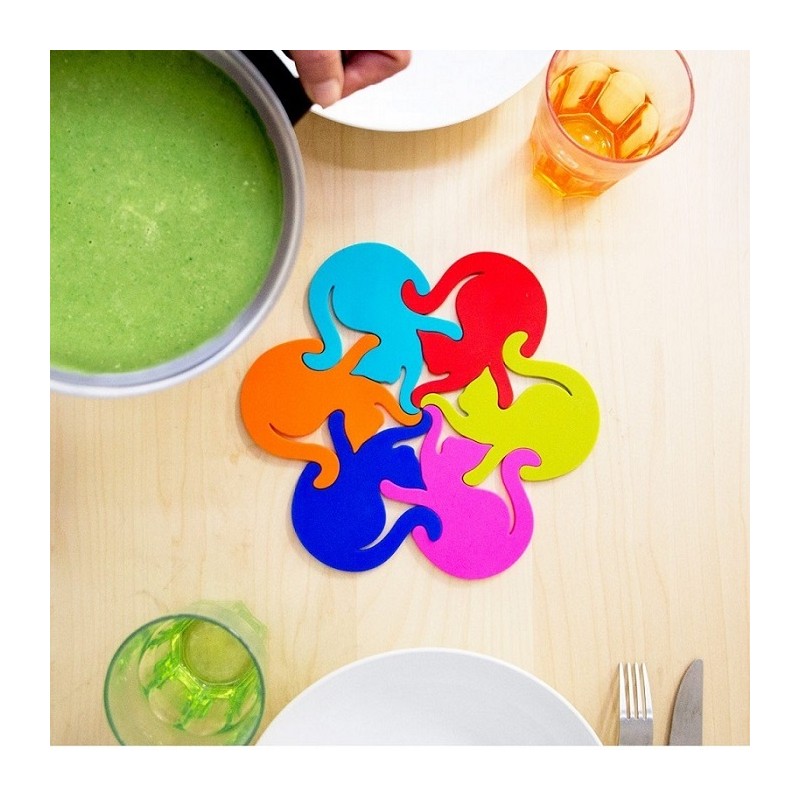 Nous sommes six, patte dans la patte pour supporter les plats brûlants. On pourra toujours accueillir les verres si vous nous séparez ! Miaou !